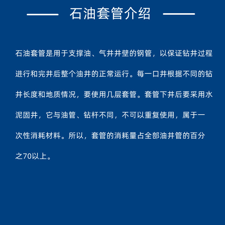第十版石油套管API 5CT。石油套管主要用于石油油井,地热井,煤气井,地热换热井,煤矿回填,煤矿泥浆回填等,,河北新盛生产销售|J55石油套管 |P110石油套管|N80美标石油套管|石油套管光亮管及成品管钢级是J-55,K-55,N-80,P-110,C-75,C-95等,规格主要为219*7.72石油套管,